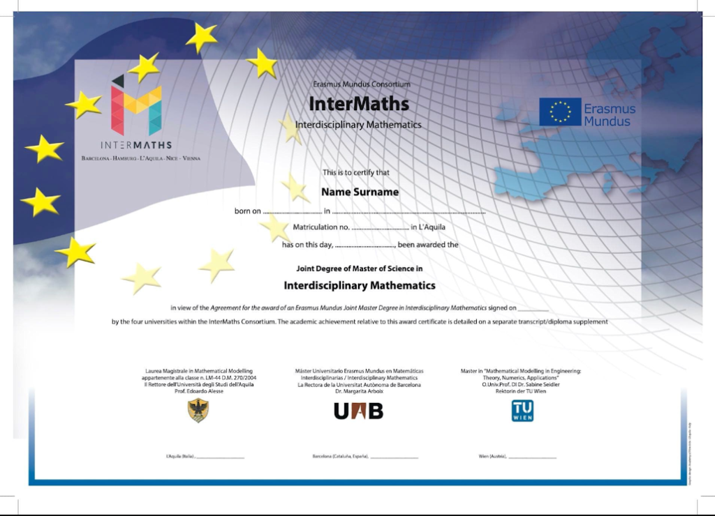 Erasmus Mundus InterMaths Joint Master Degree certificate showcasing a multi-country European collaboration in interdisciplinary mathematics